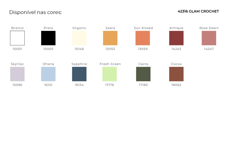 Sugestão de combinação: recomendamos coordenar Glam Crochet com os artigos Acqua UV, Acqua Light e Viva Light, para forros e/ou conjuntos que mesclam duas malhas, garantindo harmonia estética e valor agregado às peças.